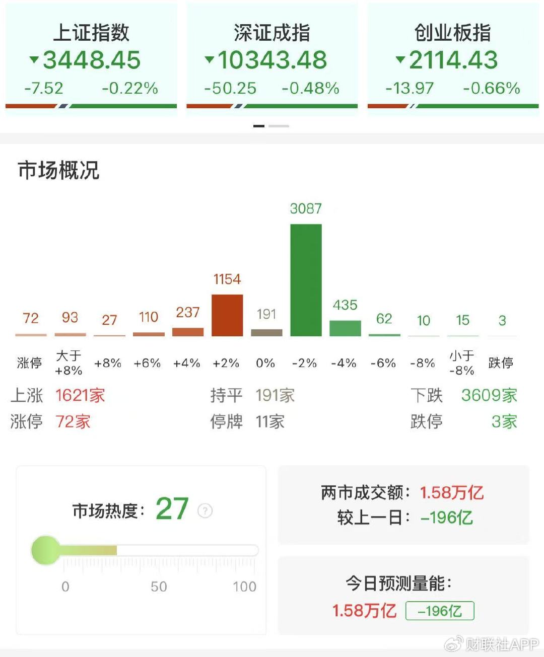 财联社6月26日讯,市场全天冲高回落,创业板指领跌。沪深两市全天成交额1.58万亿,较上个交易日缩量196亿。盘面上,市场热点较为杂乱,个股跌多涨少,全市场超3600只个股下跌。从板块来看,军工股一度冲高,万里马等10余股涨停。银行股逆势走强,工商银行等11只银行股再创历史新高。稳定币、区块链概念股持续活跃,京北方等涨停。下跌方面,创新药概念股展开调整,荣昌生物跌超10%。截至收盘,沪指跌0.22%,深成指跌0.48%,创业板指跌0.66%。